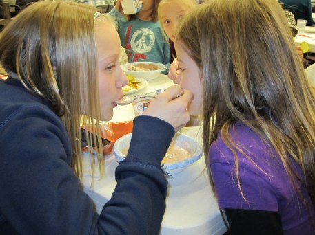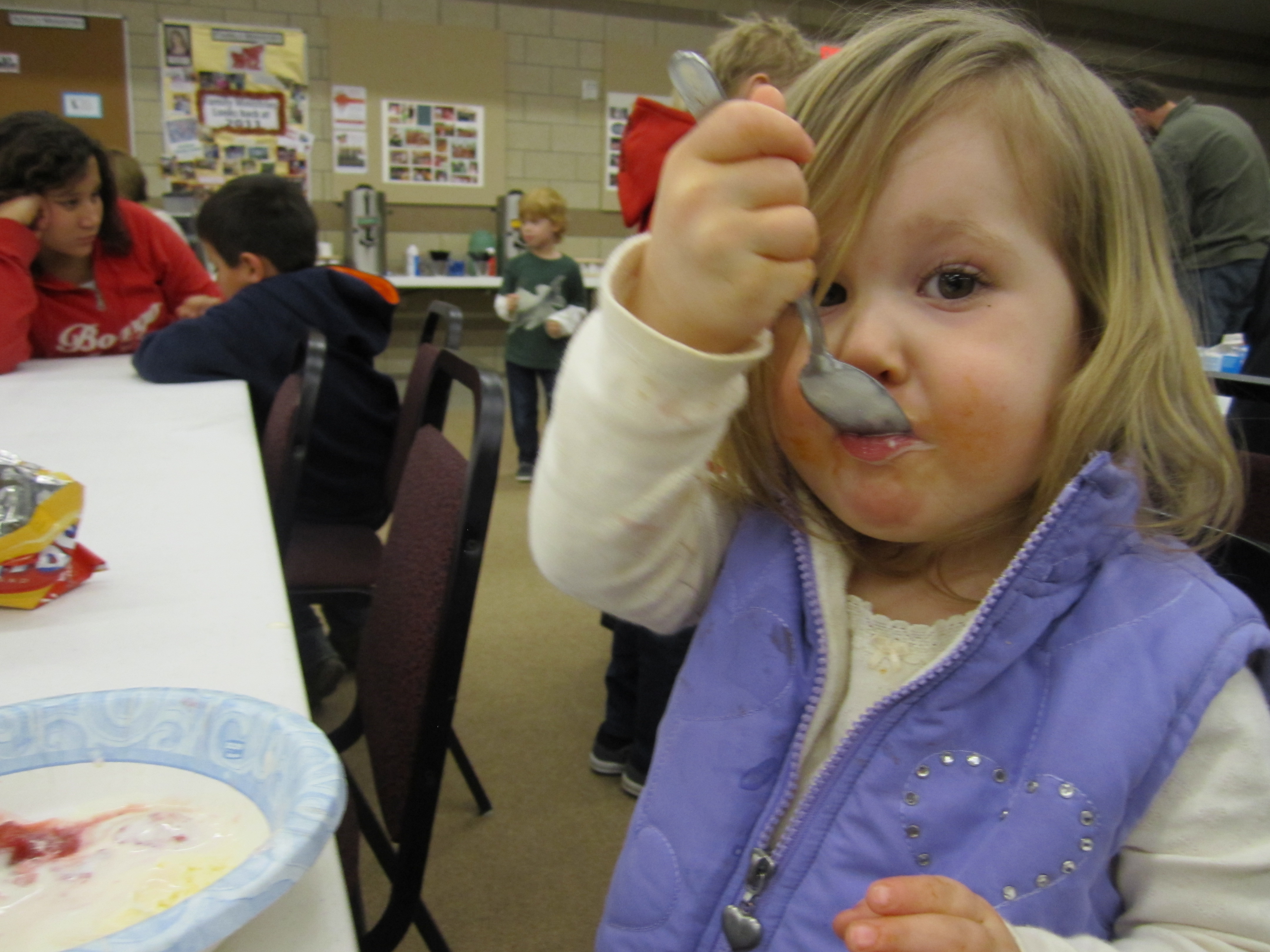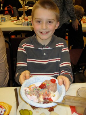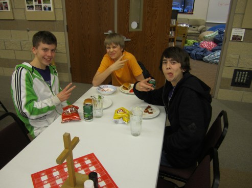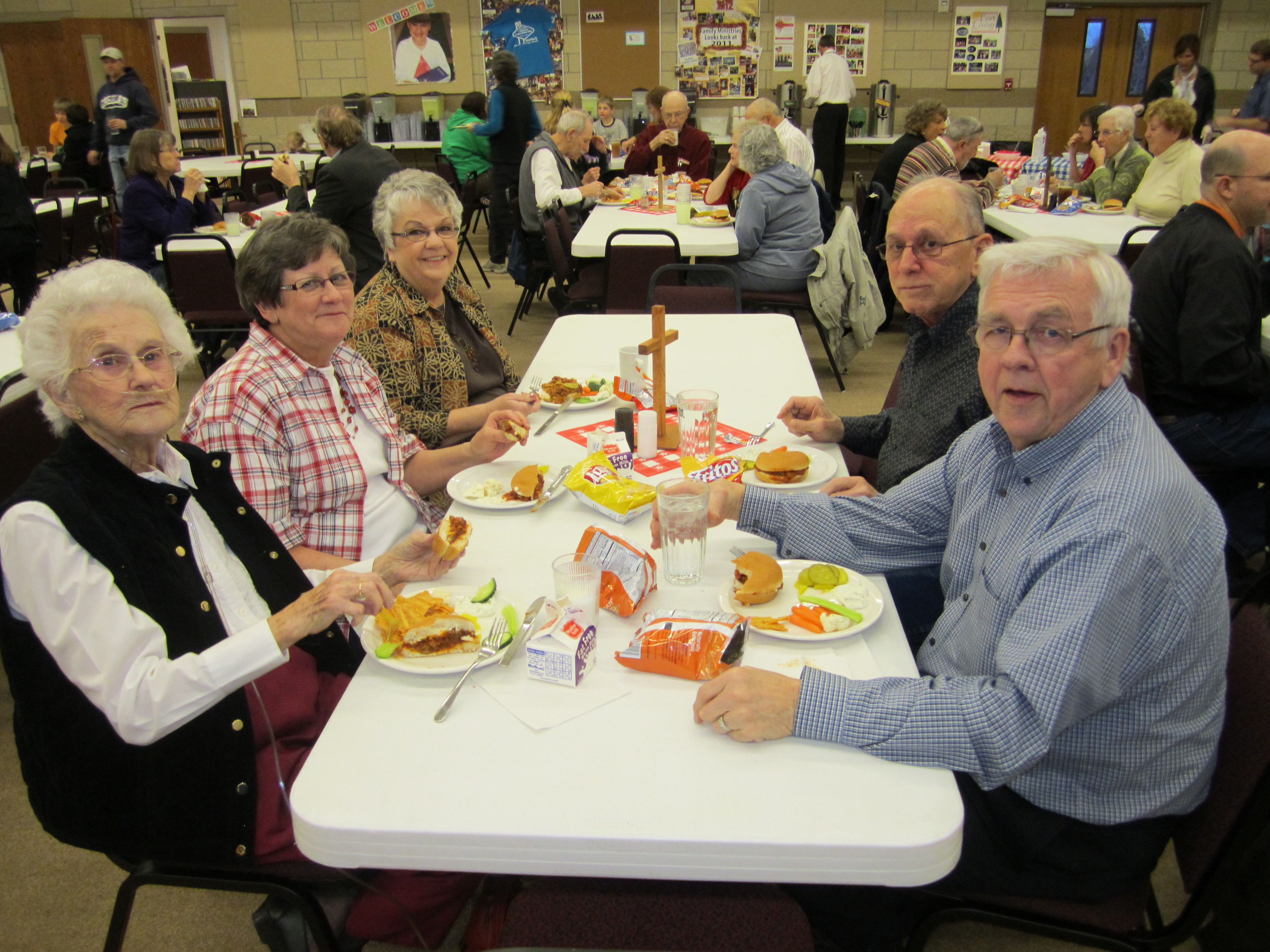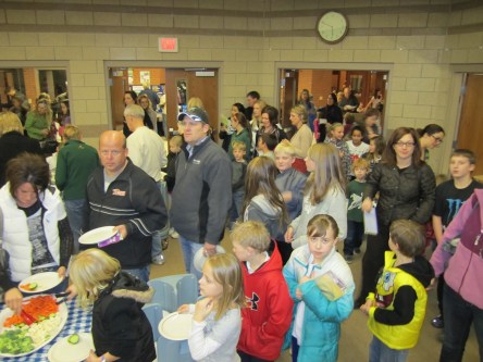 We made 5 roasters full of sloppy joes (using McCormick’s sloppy joe mix.  Last year I made Jamie Oliver’s recipe for sloppy joes with beans, but I got a lot of feedback saying “don’t bean the sloppy joes!”   I’d love to try a new recipe next time since the mix was a little too salty and tomatoey.  Feel free to email me at kschleusener@gmail.com with your favorite recipe for sloppy joes, aka “taverns” or “steamburgers”  or “yum yums” or “slushburgers” and we’ll try something new next time.  We also served some BBQ pulled pork which we had leftover from a dinner in December.  The porkloins were roasted in the oven after marinating overnight with a spice rub mix of paprika, garlic powder, brown sugar, dry mustard and salt.  We added Cattleman’s BBQ sauce after pulling the pork.