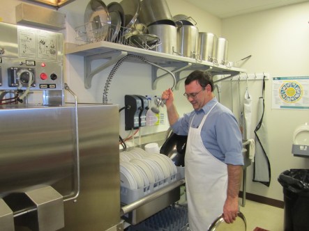 Dirty dishes in, clean dishes out.  “Marilyn”, our American Dish Service dishmachine, can wash 2 racks of dishes every 90 seconds.  We’d couldn’t do this without her!