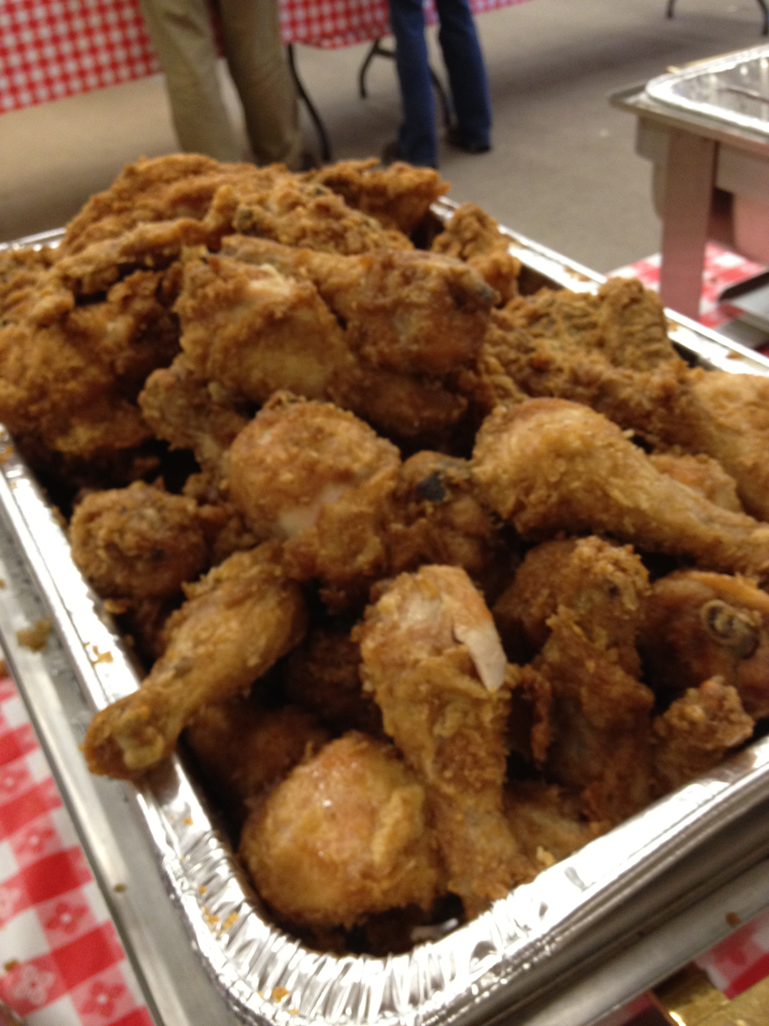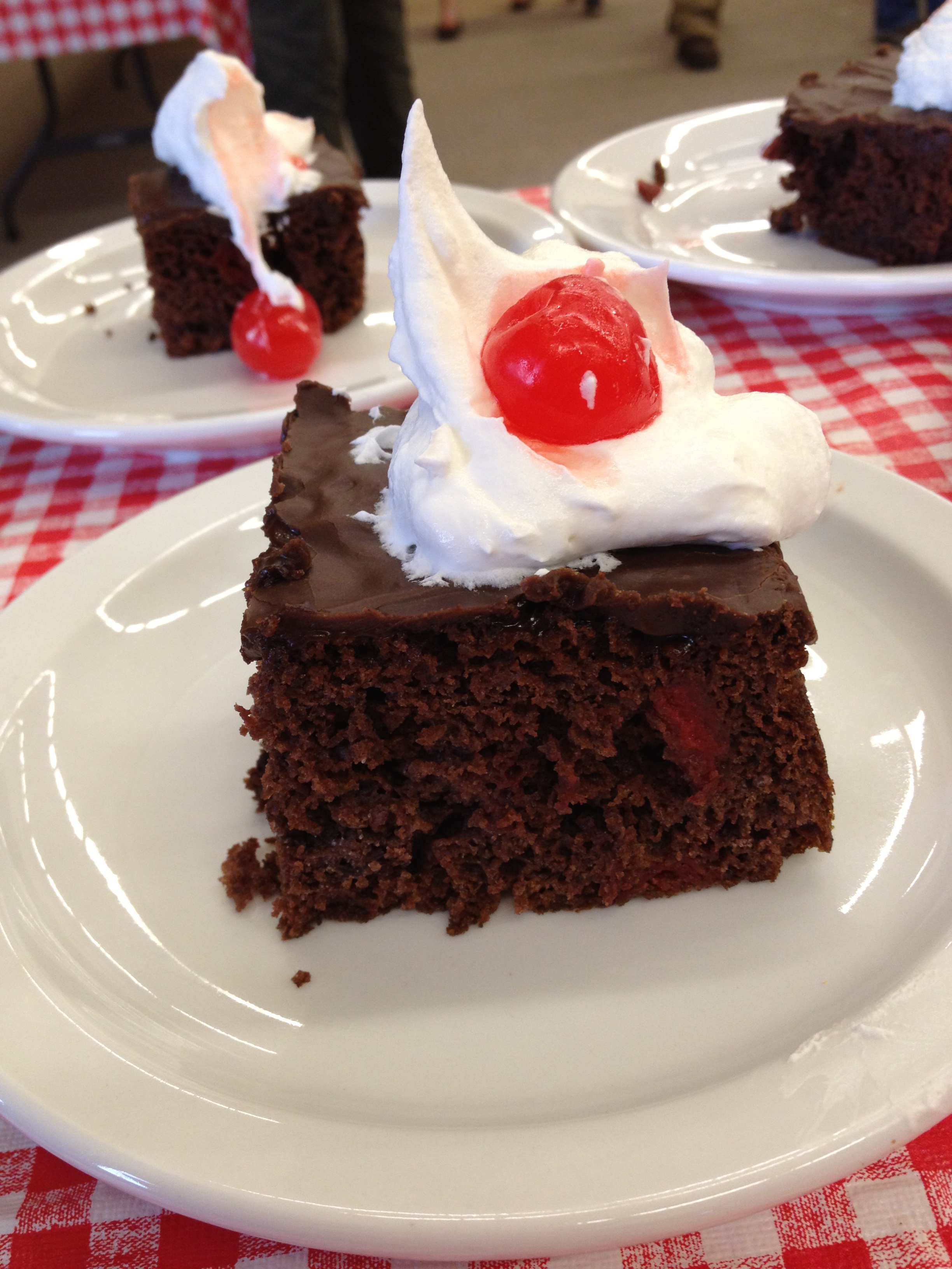 Our fried chicken dinner was delicious, thanks to a little help from Family Thrift Center on Omaha Street, who fried up 1000 pieces of chicken and delivered it to us Wednesday afternoon. We made mashed potatoes and gravy, biscuits, green beans, broccoli and chocolate cherry cake to go with the chicken, and there was not much left after serving 560 hungry people. For the biscuits we used 4 cases (576 biscuits) of Sysco’s Bakerboy Butter flavored biscuit dough, which we put into the oven directly from the freezer and baked for 12 minutes. We steamed the broccoli, boiled the green beans, and seasoned both with seasoned salt and a little melted butter. Our mashed potatoes were mixed up using 22 packages of Excel Potato Pearls, hot water, and some cream cheese and sour cream added to each batch. Six gallons of gravy was mixed up in 2 large roasters using Sysco turkey gravy mix. For dessert, we baked 14 chocolate cherry cakes in 12 x 20 x 2 inch cake pans on Tuesday morning. We topped it with whipped cream or cool whip and a cherry (recipe below).