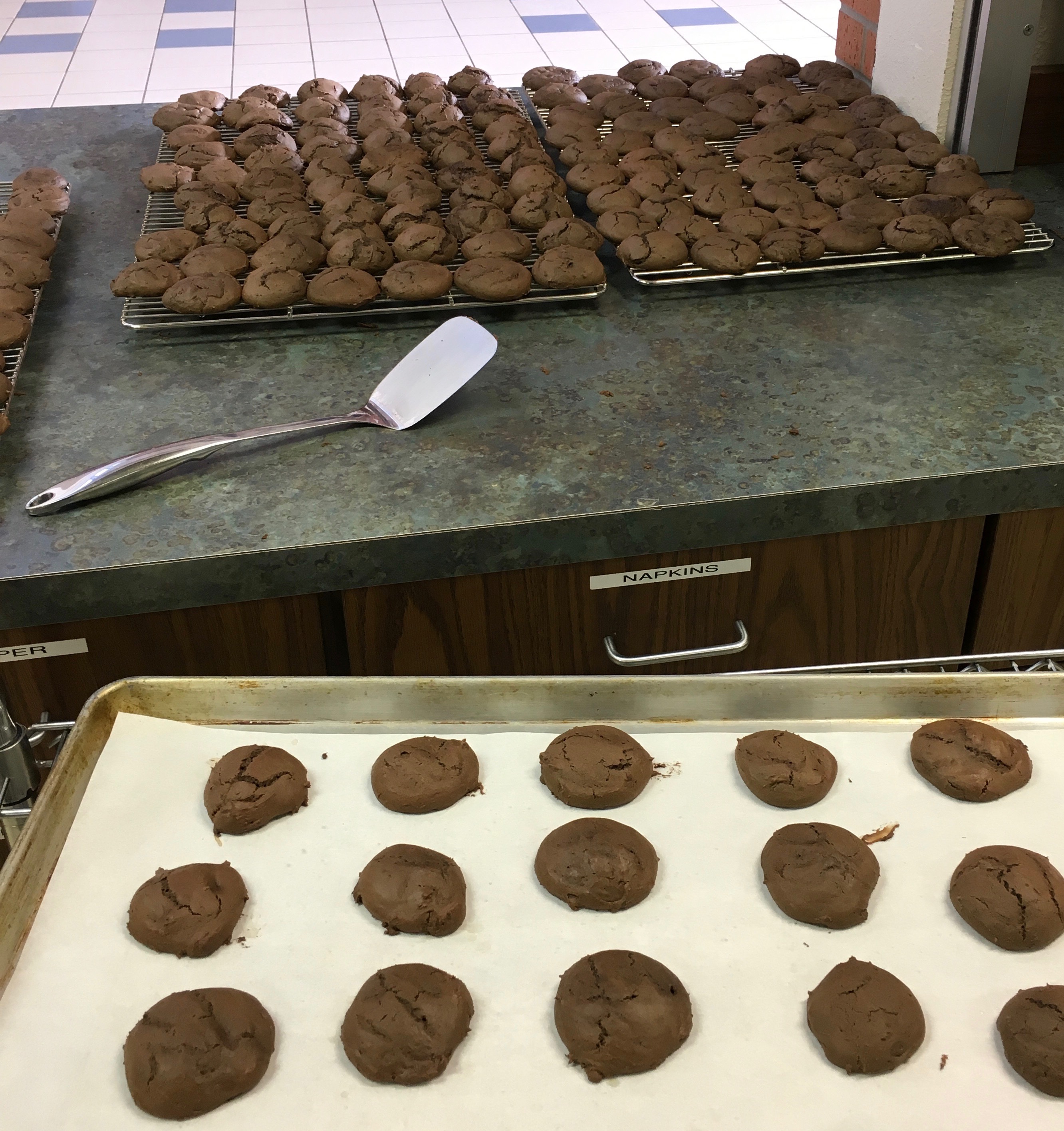 This morning the Calvary kitchen volunteers made 800 whoopie cookies. Tomorrow we will fill them with a marshmallow fluff filling to make 400 Whoopie Pies! Here’s the recipe: