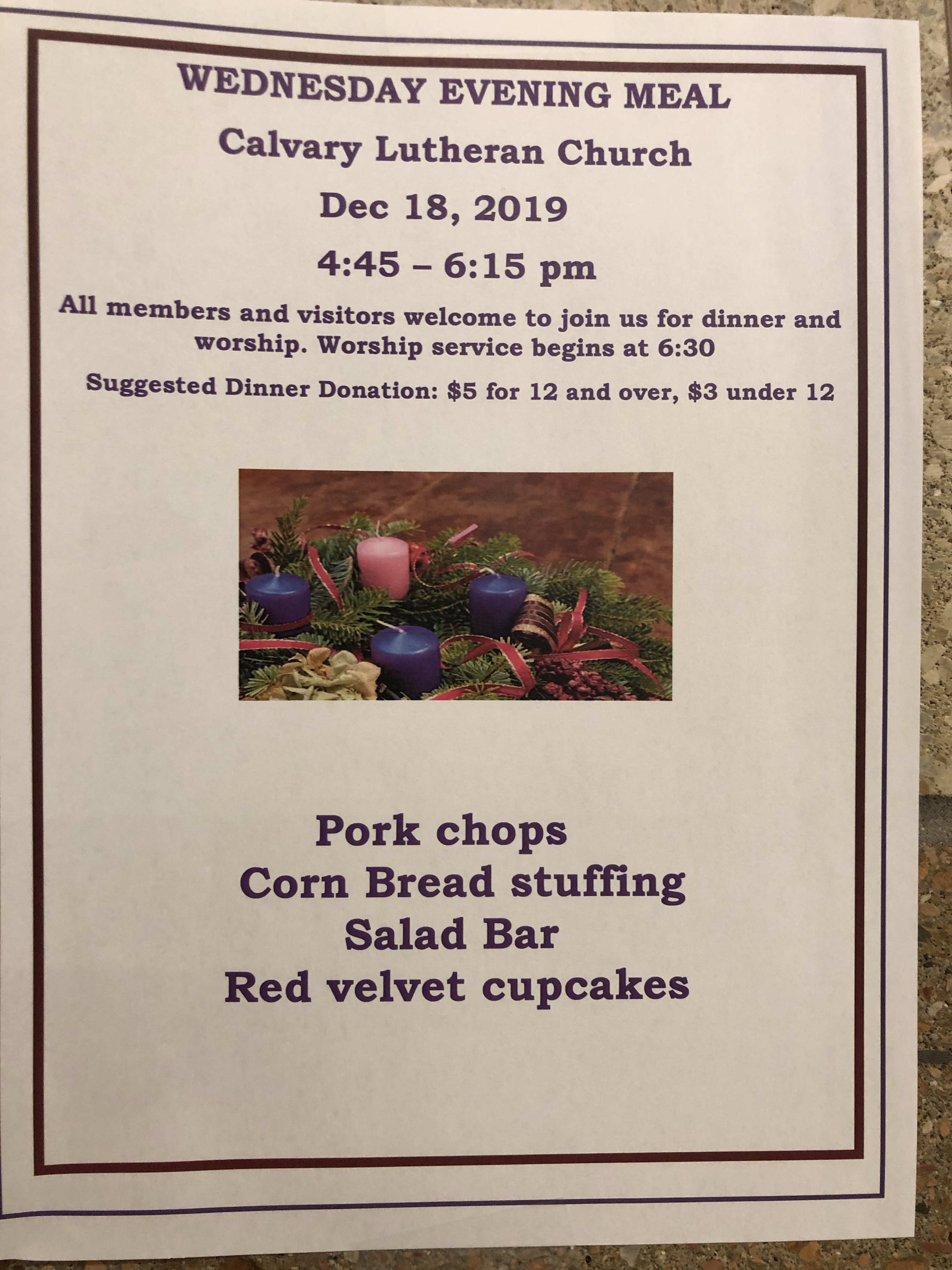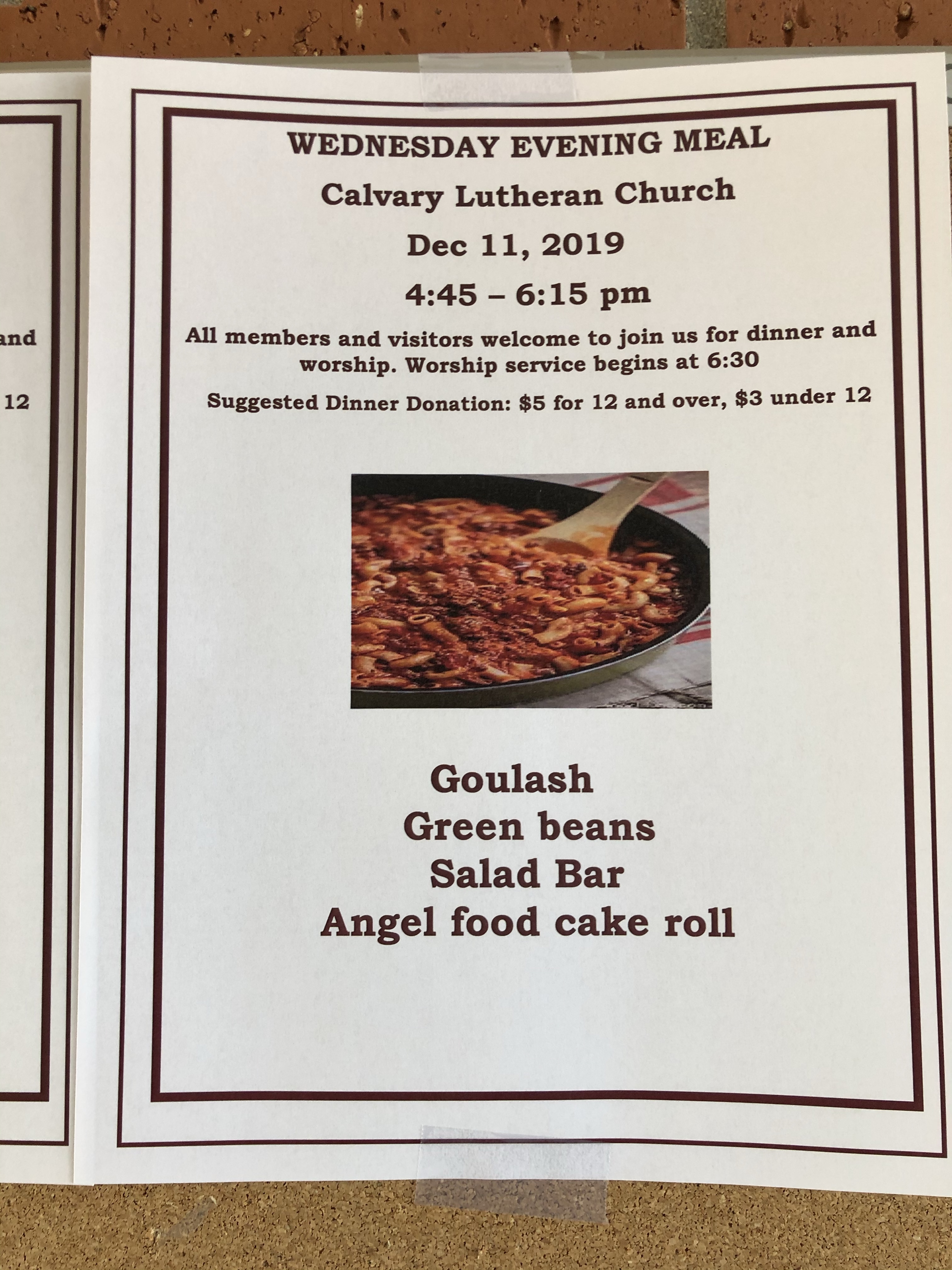 We have 2 weeks of Wednesday meals before we take a break for Christmas. Wednesday programs will resume on January 8th.