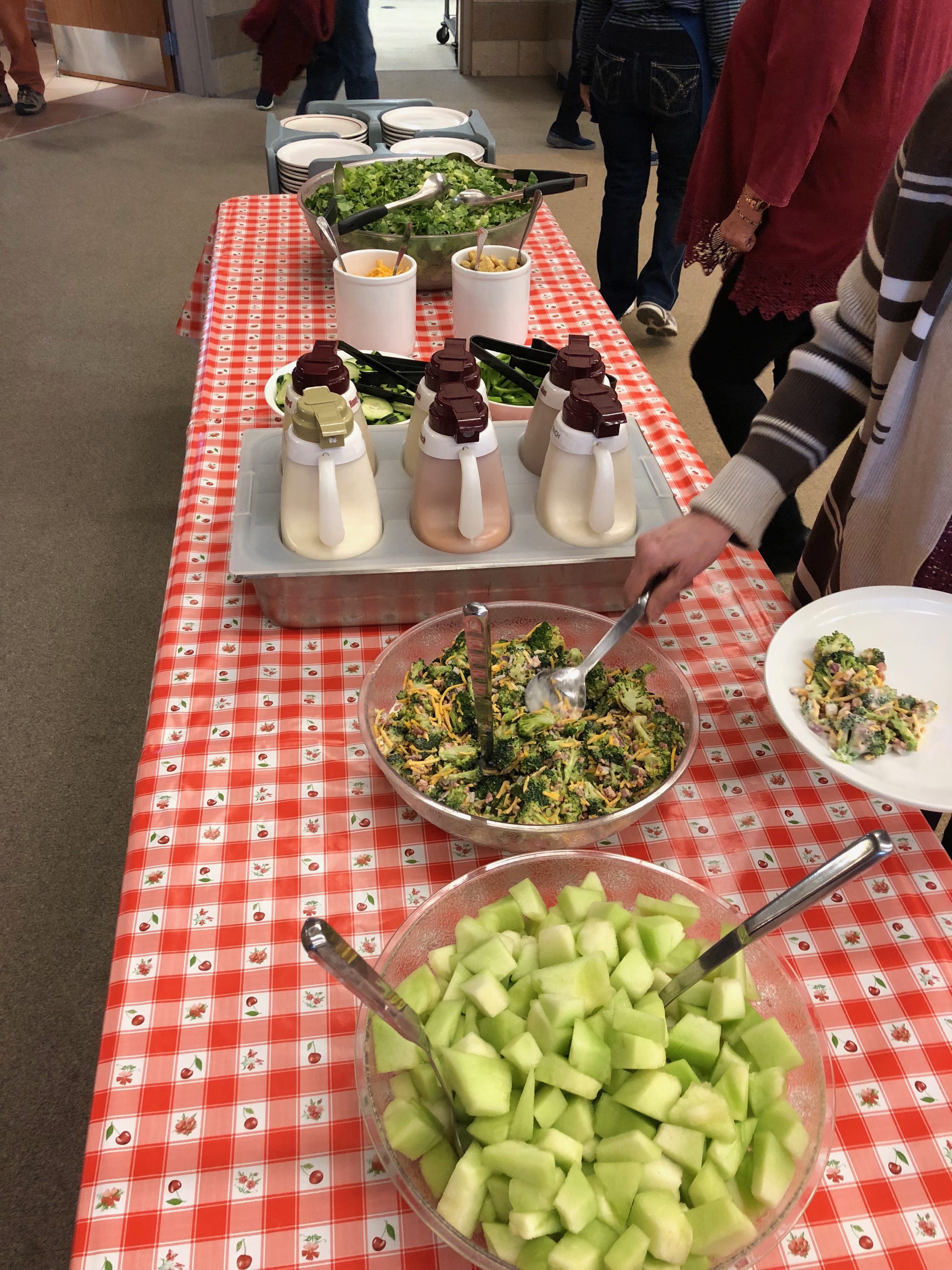 Reuben (Corned Beef) and Rachel (Turkey) Casseroles, Salad Bar, Rhubarb Dessert