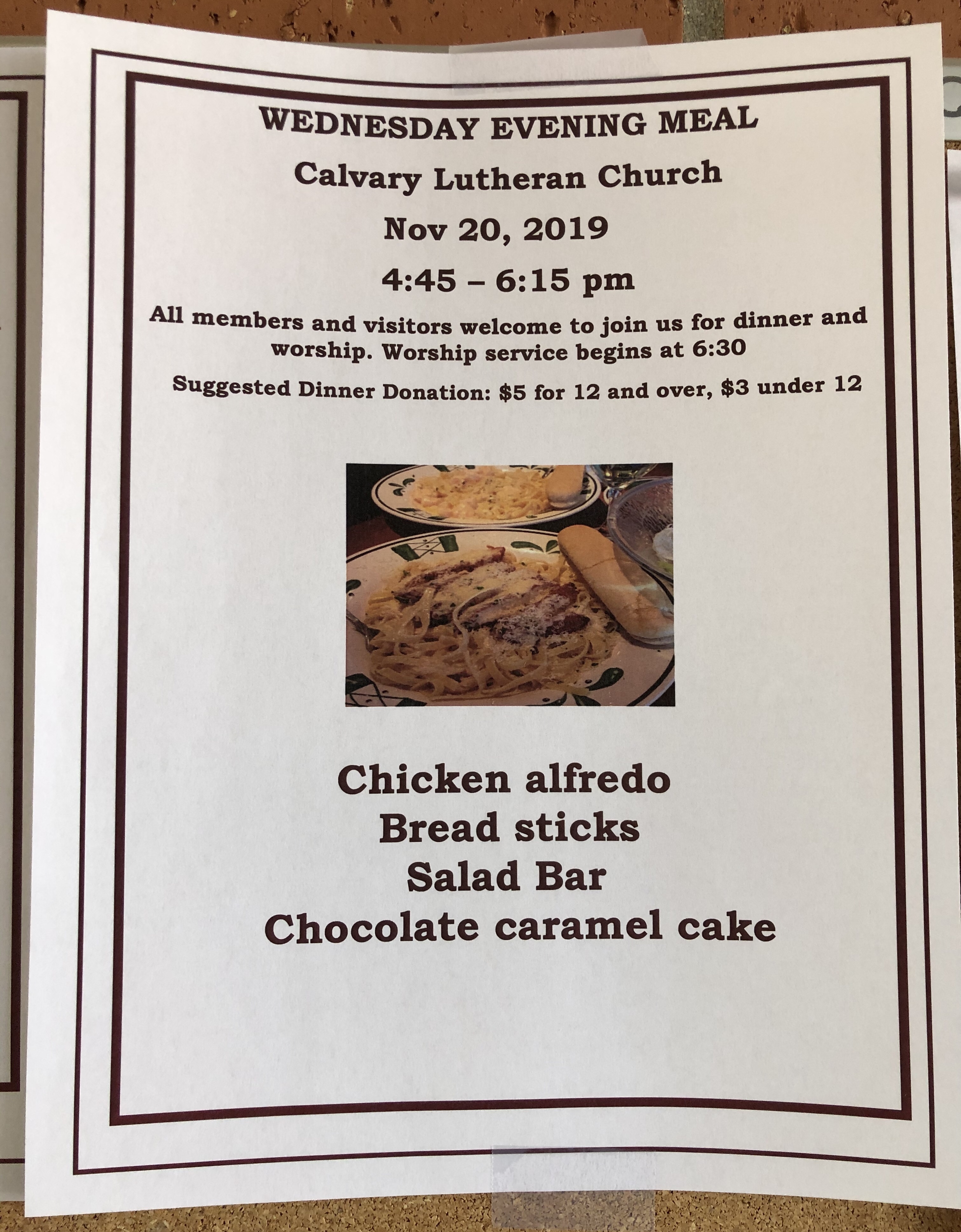 The Calvary Lutheran Church kitchen will be serving Chicken Pot Pie, a Winter Fruit Salad, Salad Bar and a Pumpkin Dessert. We invite everyone to join us between 4:45 and 6:15 pm and stay for worship after dinner.